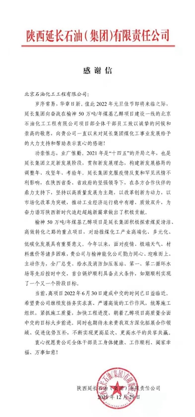 在北京石油化工工程有限公司總承包的延長(zhǎng)石油榆神能化50萬噸/年煤基乙醇項(xiàng)目緊鑼密鼓、加快建設(shè)的關(guān)鍵時(shí)期,12月29日,陜西延長(zhǎng)石油(集團(tuán))有限責(zé)任公司向我公司發(fā)來感謝信,對(duì)我公司2021年乙醇項(xiàng)目建設(shè)工作給予了充分肯定和高度評(píng)價(jià)。