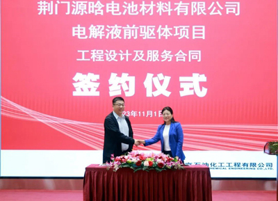 11月1日,荊門源晗電池材料有限公司(簡稱:荊門源晗)電解液前驅體項目工程設計及服務合同簽約儀式在北京石油化工工程有限公司(簡稱:北油工程)舉行。荊門源晗公司總經(jīng)理周虎,北油工程公司黨委副書記、總經(jīng)理田偉代表雙方簽署協(xié)議。