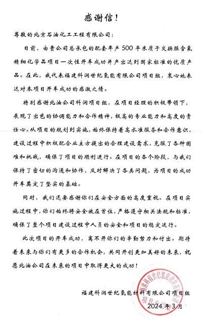 近日,北京石油化工工程有限公司收到福建科潤世紀氫能材料有限公司發來的感謝信,對我公司在負責配套年產500平米質子交換膜含氟精細化學品項目期間,出色的協調能力和合作精神,極高的專業能力和高度的責任心給予了高度評價。