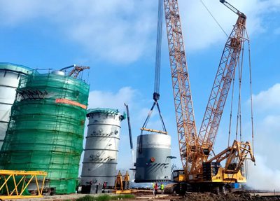 目前,DMC裝置主框架鋼結(jié)構(gòu)開始安裝,同時一塔、三塔下段裙座已吊裝就位。兩塔直徑均為8米,高度分別為66.08米和66.7米,重量為455噸和411噸,此次吊裝采用600噸履帶吊,分四段制造及四段吊裝。 為確保順利吊裝,業(yè)主、監(jiān)理、總包、施工單位召開多次吊裝專題會,結(jié)合場地實際情況,研討制定吊裝方案,嚴(yán)格按照操作要求進(jìn)行施工。在各方人員密切配合下,高質(zhì)量完成了本次吊裝任務(wù)。