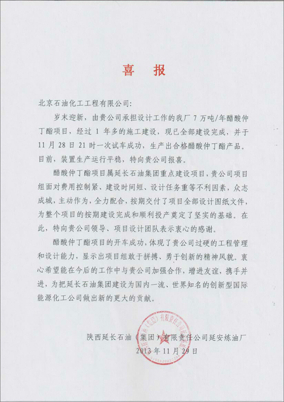 由我公司設(shè)計的陜西延長石油(集團)有限責(zé)任公司延安煉油廠7萬噸/年醋酸仲丁酯項目,經(jīng)過近1年的設(shè)計、采購和施工建設(shè),整個工程已全部建設(shè)完成,2013年11月28日一次試車成功,生產(chǎn)出合格的醋酸仲丁酯產(chǎn)品,目前各裝置生產(chǎn)運行平穩(wěn)。為此,業(yè)主單位特向我公司發(fā)來喜報。